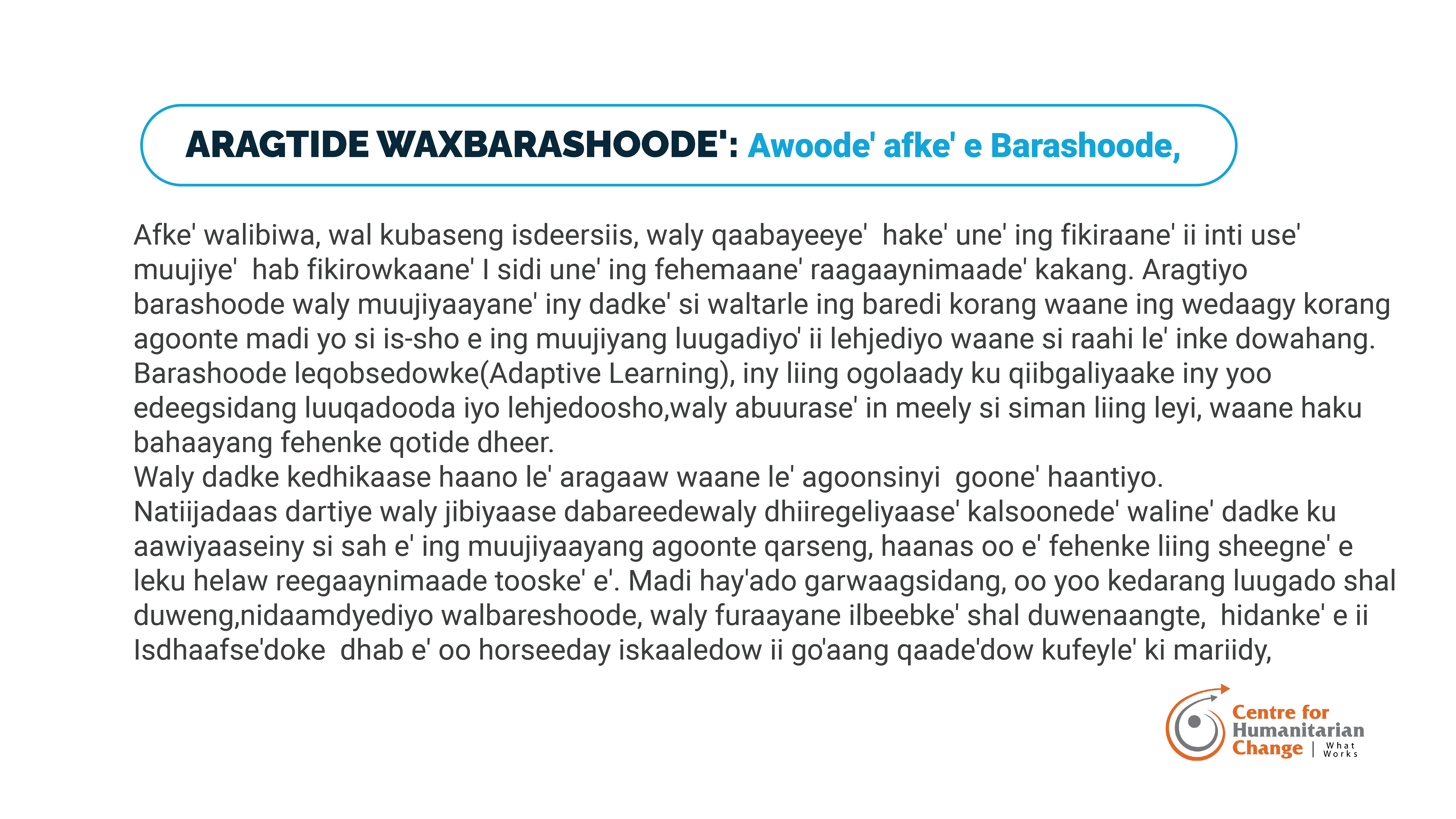 Une' oo abuurne' meel leke' wedaage kore' si daa' ad e' waly hididke' ing adkaayney iskaaledow qoti-dheer, ii saldhig ade' g oo leke' hormariye kore barashoode leqobsedowke le'(Adaptive Learning).