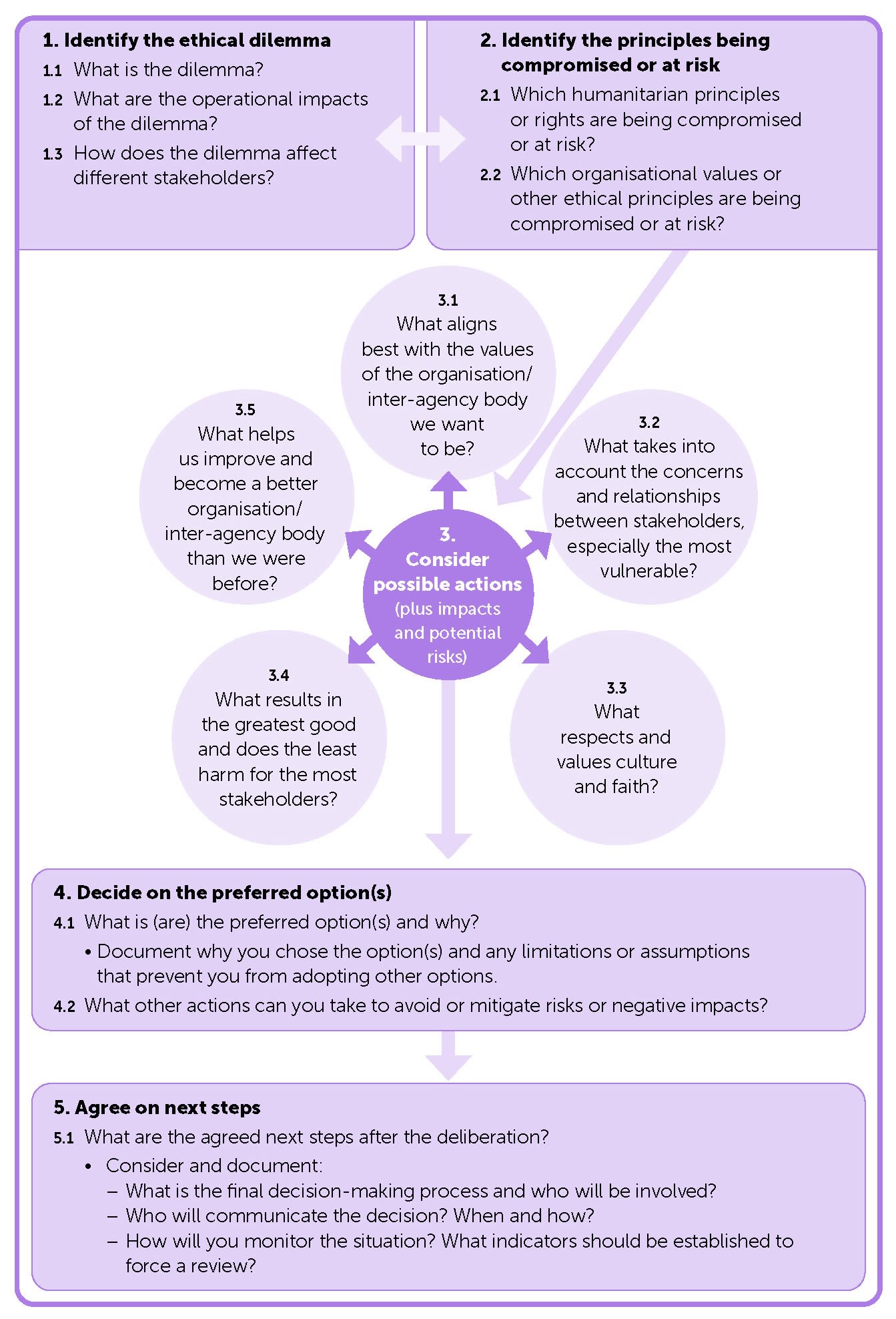 Examine how the organisation/inter-agency body can get better at managing the dilemma in a principled way. Dilemmas are recurring events and you should not treat them in isolation. Dealing with dilemmas contributes to the practical development of the organisation’s/inter-agency body’s values, principles and culture.